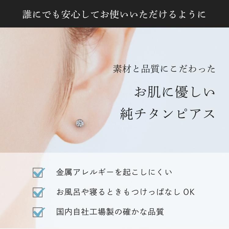 ポストはもちろん、石座やキャッチまで、金属部分はすべて純チタン製なので、金属アレルギーの方や敏感肌の方も安心してお使いいただけます。